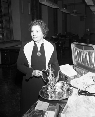 Mrs. Mabel McCaslin, switchboard operator. Mrs. McCaslin is shown admiring a tea set.