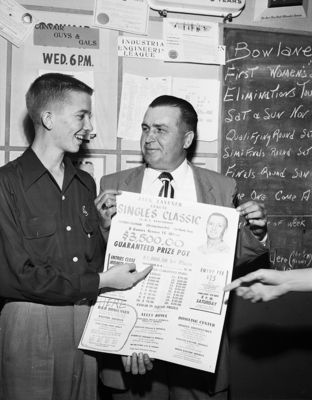 Southpaw Threats - Eddie Brickell, left, checks prize list in $3500 Jack Tavener Bowling Classic as fellow lefthander Jim Furche looks on. Furche has city's top average, 194 for two leagues, and Brickell, 18, won recent elimination tournament to represent Fort Worth in National All-Star in Chicago in December.