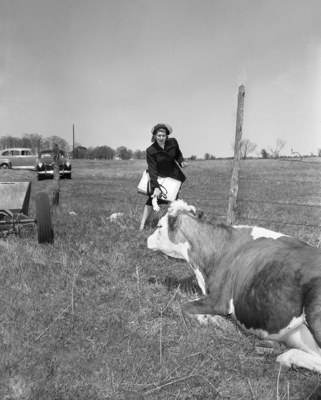 Mrs. William R. Nichols of Grapevine, a rural census enumerator, finds barbed wire fences and forbidding-looking cows all in a day's work as she trudges from a farm, taking the agricultural and population census in Tarrant County. She is one of 51 enumerators working in county, excluding Fort Worth. Published in Fort Worth Star-Telegram morning edition April 6, 1950.