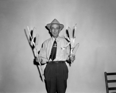 The three small, sound ears on the stalk Hill County Agent C. H. Clark holds in his right hand weigh more than the two large ears on the stalk in his left hand.