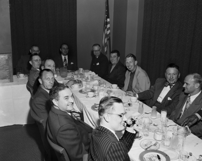 Shown are some of the Golden Gloves officials seated at a long dining table. A. J. Cooles (fourth from the right) is the only person identified. Published in Fort Worth Star-Telegram evening edition January 28, 1952.
