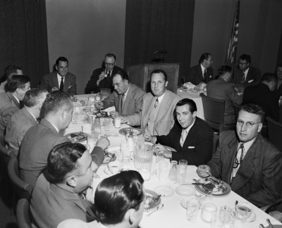 Show are the Golden Gloves officials seated at a long dining table. They are, left to right, Guh Witherspoon, Flem Hall, Travis McCall, Rip Johnson, Jerry Hahn, and A. E. Wooten. Published in Fort Worth Star-Telegram evening edition January 28, 1952.