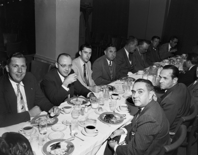 Golden Gloves officials are shown seated at a long dining table. They are (clockwise); Paul Irwin, J. L. Norton, George Graves, Arch Wayman, Richard Craig, T. L. Yates, Bill Quinn, Bob Vollmer, John Waller, John Waller, and Woodie Taylor. Published in Fort Worth Star-Telegram evening edition January 28, 1952.