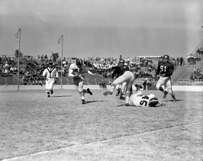 Ray McKown in action for Texas Christian University against Baylor. They'll be key figures in Longhorn-Frog clash. Published in Fort Worth Star-Telegram morning edition November 12, 1952.