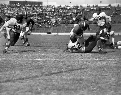 The only new offensive back Texans will start against Texas Christian University will be Billy Quinn, from San Antonio. He is shown making a four-yard gain against Southern Methodist earlier in the season. Published in Fort Worth Star-Telegram morning edition November 13, 1952.