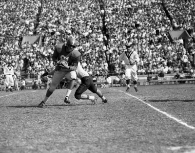 Carlton Massey, big Texas end, who played sensationally on defense against Southern Methodist, takes a pass for a 9-yard gain in first quarter against Mustangs. The catch was part of a Texas touchdown drive. Published in Fort Worth Star-Telegram morning edition November 2, 1952.