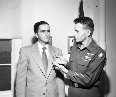 Master Sgt. Kenneth E. Morgan, 25, left, receives a Silver Star medal from Maj. Borden T. Wright at the Army Organized Reserve Armory. Morgan was awarded the medal for gallantry in action in Korea in June.