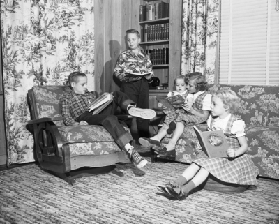 One of the most popular girls' books used to be "The Five Little Peppers" - but here the five children of Dr. and Mrs. W. D. Marrs, display varied reading habits. Left to right are Charles, Scott, Mary Elizabeth, held by Cynthia, and Alice Ann.