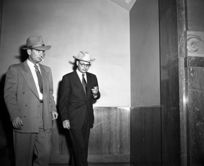Sentenced - Joseph Stuart, left and his brother Judd Stuart leave U. S. Courthouse en route to jail. The Strawn bankers were sentenced to 18 months' imprisonment each in the U. S. District Court Tuesday afternoon after pleading guilty to charges of embezzlement.