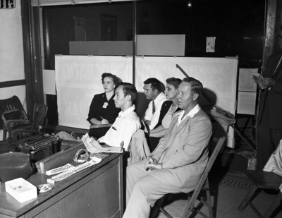 Democrats Watch Returns - Stevenson-Sparkman workers watched election returns Tuesday night on television at the Women for Stevenson Headquarters, 9th and Commerce. Left to right, they are Mrs. Roy Hathcock, Don Morgan, Bill Engelfried, Mrs. G. F. Keatts, president of the Tarrant County Democratic Women's Club, and W. J. Brown.