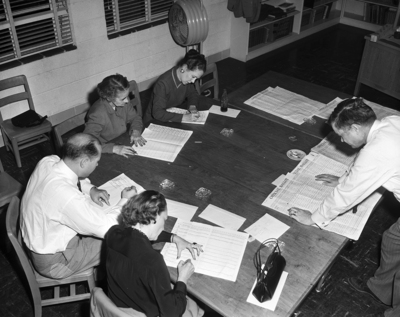 Sets Counting Pattern - Precinct 117 election workers at Bluebonnet School under direction of Precinct Chairman Homa Hill set a counting pattern in Tuesday's election by completing the count of 2737 ballot by 9 p. m. Eighty-five percent of the precinct's strength turned out to vote. Eisenhower led in the precinct, 2221 to 532. Counting, left to right, are Miss Florence Kerr, Truitt Kennedy, Mrs. Roy Douglas, Mrs. James Hagood and at right, Homa Hill, who is calling off the votes.