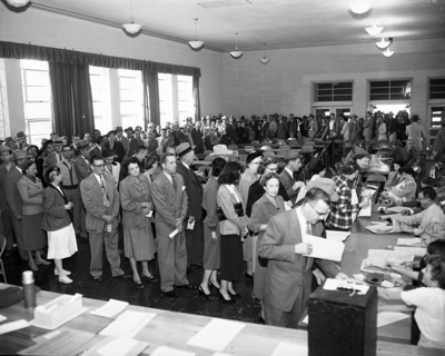 Packed Polling Place - Voters jammed polling places in Fort Worth and Tarrant County Tuesday, as evidenced by these photos taken at Precinct 117, Bluebonnet School. Crowds of voters here were so great they had to be moved to permit children to enter school. A block-long line awaited officials when the voting started at 7 a.m. At 11:30 a. m., 1200 of the precinct's 3180 voters had cast their ballots.