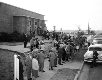 At noon voters had to go to the schoolyard to make room for children to eat their lunches in the auditorium. They leaned again outside walls to mark ballots.