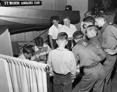 Donnie McCaughan and Billy Lamb demonstrate fly-tying for a group of Boy Scouts at the Fort Worth Anglers Club booth. Mmes. Arthur Tuck and John Cadwallader, left background, are on hand to sell club memberships. Published in Fort Worth Star-Telegram morning edition April 9, 1950.