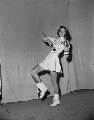Julia Troeger, 16, a tennis star at Denton High School, holds the trophy she won in the regional baton twirling contest conducted as the opening show at Will Rogers Memorial Coliseum. Published in Fort Worth Star-Telegram morning edition April 9, 1950.