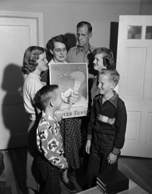 Hundred Percenters - The R. J. Oliver family groups around a sign placard urging contributions to the United Fund. They can well smile, for they contributed 100 percent. Shown, left to right, are Roy, Ida, Mrs. Oliver, Oliver, Joan and Edward.