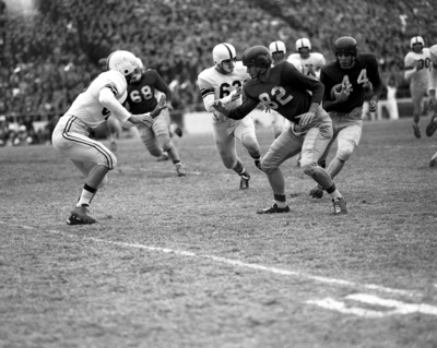 Jerry Norton, spearhead of the Southern Methodist attack that beat A&M, runs for nine yards in the first quarter. Jimmy Hawn (82); and W. T. Rush (63), are others in the picture. Published in Fort Worth Star-Telegram morning edition November 9, 1952.