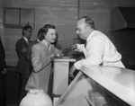 Mr. Wayne McDonald is shown to the right of the image, leaning against a counter. To the left of the image stands an unidentified woman, several other unidentified men can be seen in the background. Mr. McDonald is serving the woman food.