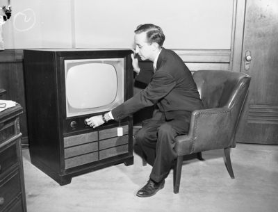 Keith Rawlings tries out a television set, a good gift for the whole family at Christmas.