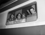 Fifth graders from Sagamore Hill School, took a Parent Teacher Association sponsored trip by train to Dallas. Four kids are shown in the image waving out of an open train window. The children, left-to-right, are Curtis Roger Roy, Winnie Beth Beck, Sarah Browne, and Jon Smith. Published in the evening edition, April 8, 1950.