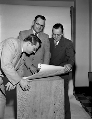Looking over their plans for Birchman Avenue Baptist Church's expansion program are, left to right, Reverend B. O. Baker, pastor; Marvin N. Wheat of 2204 Glenco Territory, campaign director, and E. M. Gore of 3637 Birchman, campaign assistant.
