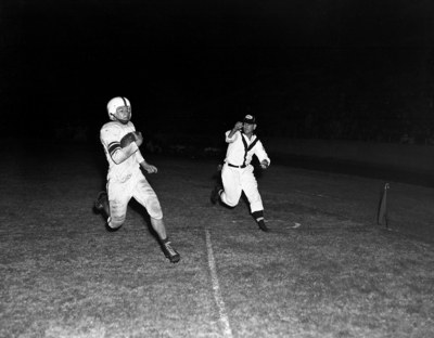 Carter Riverside's Boyd Dollar completes 20-yard scoring sprint against Poly at Farrington Field. Dollar scored both touchdowns in 12-0 victory. Published in Fort Worth Star-Telegram morning edition November 15, 1952.