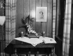 Image shows Mrs. Howard Kittel's interpretation of Michelangelo's "Resurrection", which is the feature at the Garden Center. An antique print of the "Resurrection" hangs above the arrangement and W. R. Valentiner's book, "Michelangelo" complete the composition. Published in Fort Worth Star-Telegram morning edition April 9, 1950.