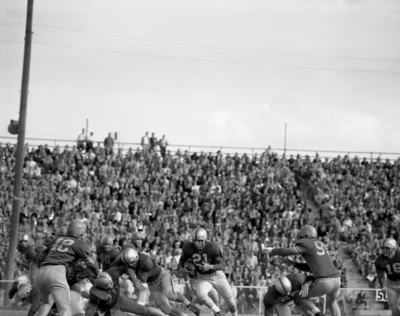Jim Turner, Texas Tech back, races for a short gain against Hardin Simmons in the first quarter at Abilene. Making the block on the Cowboys' John Waedekin (79) is the Raiders' Hollice Davis. The teams tied, 14-14. Published in Fort Worth Star-Telegram morning edition November 16, 1952.