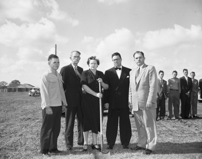 Ground was broken Sunday noon at Kennedale for a new $52,800 church and educational department for First Baptist Church. Participating in the ceremonies were, left to right, A. L. Bulin, chairman of deacons; Mrs. Lottie Cummings, member of the church and long-time resident of the community, and Reverend T. L. Austin, pastor.