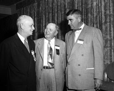 Reception talk - R. E. Vernor, left, treasurer of Rotary International, R. E. Jackson of Denton, center, and Jack Broad of Brownwood chatted at the reception honoring Vernor at Hotel Texas Sunday afternoon during the annual conference of the 186th District of Rotary International. Jackson is a past district governor and Broad is president of the Brownwood Rotary Club.