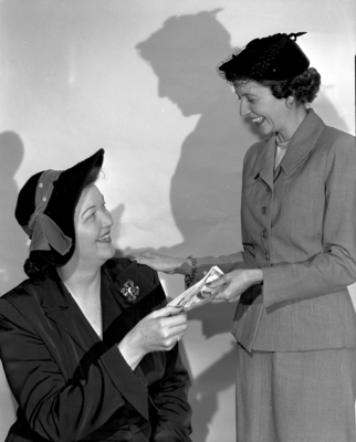 Miss Jo Kelly, left, director of special education in public schools, is shown receiving $75 from Mrs. Vernon Baird, treasurer of the Kiwi Club, as the first donation for purchase of equipment needed for a classroom in City-County Hospital for patients with polio.