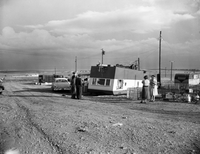 Bottoms Up - High winds Monday afternoon overturned four trailers on Highway 183 at Grant's Lane. This one belongs to W. B. Thomas Jr. Mrs. Thomas was not in the trailer but saw it capsize and was treated at Harris Hospital for shock and fright.