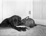 Image shows grey rabbit and a dog sharing a carrot. Published in Fort Worth Star-Telegram morning edition April 7, 1950.