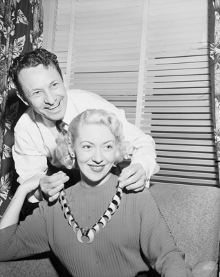 Mrs. Clyde Beatty registers joy as her husband - the famed wild animal trainer - fastens on her necklace made from lion and tiger claws. Mrs. Beatty is happy because the claws are from dead jungle cats. The Beattys are here for the Shrine Circus, opening Friday night in Will Rogers Memorial Coliseum.