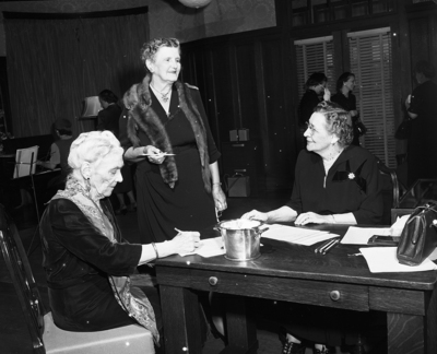 The pre-Thanksgiving tea last week of the All Church Home brought together women of every denomination, all interested in the work of the home, of which Mrs. James C. Wilson is president. These pictures show friends and patrons enjoying the tea. The "unbonneted ladies" of the houseparty included, left to right, Mmes. Truman H. Conner, James A. Coker and C. F. Adams, at the guest register.