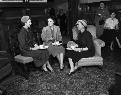The pre-Thanksgiving tea last week of the All Church Home brought together women of every denomination, all interested in the work of the home, of which Mrs. James C. Wilson is president. These pictures show friends and patrons enjoying the tea. Enjoying an over-the-teacups visit are Mmes. Paul Morrison, Bill Houk and Ardell Young, left to right, guests.