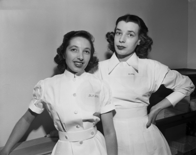 Two doctors from Abilene who have been in school together since the first grade are Dr. Mary Booth, left, and Dr. Joanne Kenner. Published in Fort Worth Star-Telegram evening edition April 12, 1950.