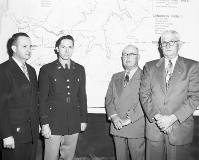 Left to right is, Sproessor Wynn, Colonel H. R. Hallock, Ed Sproles, and A. R. Cartwright Senior. The four men are standing in front of a map of Benbrook Lake in Tarrant County, Texas.
