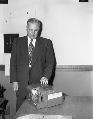 G. N. Westerfeld, Western Union superintendent here, watches a message move out on the company's newest mechanical time saver. The machine, called the Desk-Fax, is being installed in downtown offices to facilitate speed in dispatching telegrams.