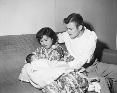 Theresa Linda Bush, first baby born to a Japanese war bride in Fort Worth, is being coaxed into an eye-opening mood by her mother and father, Mr. and Mrs. Earl Bush.