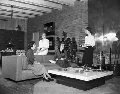 The YWCA-sponsored tour of homes, which will be held December 9 and will be open to the public, will include four homes and a World Fellowship Bazar at one of them. Today's pictures include women who will be hostesses during the tour of the homes. Planning her part in the tour, Mrs. Earl Wilson Junior, right, discusses plans with, left to right, Mmes. A. F. Kauffmann, R. Hunter Barrett and A. R. Ponton Junior. Interior of the home is shown. The home is located at 4225 Ridgehaven Road.