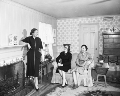 The YWCA-sponsored tour of homes, which will be held December 9 and will be open to the public, will include four homes and a World Fellowship Bazar at one of them. Today's pictures include women who will be hostesses during the tour of the homes. In an upstairs bedroom at the Walton Wilfong home, left to right, are Mrs. Wilfong, Miss Mary Louis Anderson and Mrs. H. S. Renshaw, chairman of the Young Adult committee of the YWCA. The interior of the home is shown. The home is located at 100 Williamsburg Lane.