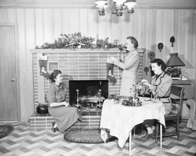 The YWCA-sponsored tour of homes, which will be held December 9 and will be open to the public, will include four homes and a World Fellowship Bazar at one of them. Today's pictures include women who will be hostesses during the tour of the homes. Fireside decorations. Mrs. R. L. McCann, left, takes time out for 'tending the fire as Mmes. S. J. Palmer, center, and Bedford Brown work on Christmas decorations. The home is located at 4129 Ranier Court.