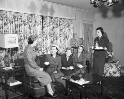The YWCA-sponsored tour of homes, which will be held December 9 and will be open to the public, will include four homes and a World Fellowship Bazar at one of them. Today's pictures include women who will be hostesses during the tour of the homes. "Cream and sugar?" is the query as Mrs. O. Paul Leonard Junior, right, serves tea to, left to right, Mmes. L. N. Wilemon, Walter Grammer, Doc St. Clair, and Granville T. Walker.