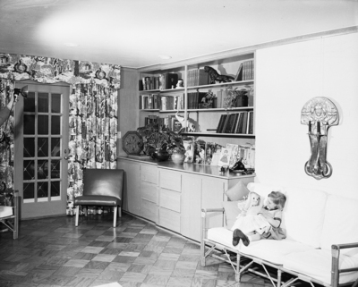 Becky, the baby in the John Scott family, climbs all over the divan in their garden room and nobody says "don't." The upholstery material is white plastic. A damp cloth cleans off marks in seconds. Modern-looking but an old piece is the brass sconce over the sofa. Other brass pieces give warmth and interest to a charming room. The room has built-in bookshelves and cabinets. Becky is sitting on the divan, holding a doll.