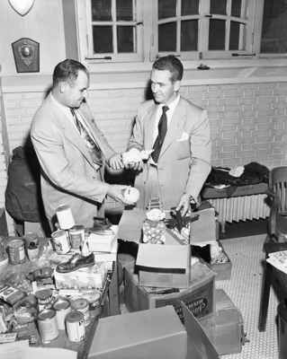 Pat Britt, left, and Harvie Lucas pack a box of toys for Korean war orphans. They were active in the Junior Chamber of Commerce drive to gather food, toys and clothes which are being sent to Korea this weekend.