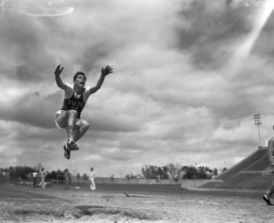 Arlington's Sterlen Sleeth aimed for first in the broad jump in the Region 3-B track meet at Dallas. Published in the Fort Worth Star-Telegram morning edition, April 22, 1950.
