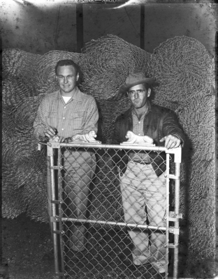 Allied Chain Link Fence Company of Houston has opened a retail outlet in Fort Worth at White Settlement Road and Jacksboro Highway. A. W. Turner, at left, formerly of Waco and graduate of Southwestern and Baylor Universities, is the Fort Worth manager. L. P. Carter, right, is superintendent of erection. The firm employs 19 salesmen here in the factory to consumer purchase plan. They are standing behind a fence gate model and there are rolled up chain link fences behind them.
