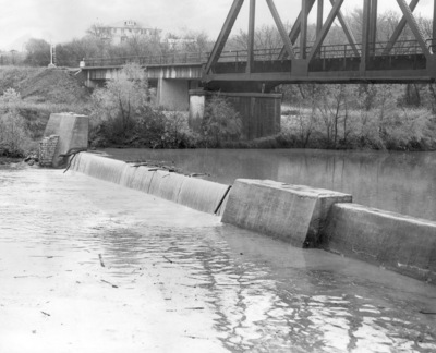 Water flows over Double Dam on Clear Fork of Trinity River in Trinity Park, 11/25/1952
