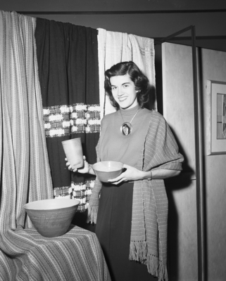Mrs. Robert Bousman, secretary of Fort Worth Art Association, is shown previewing gifts which will be for sale at the association's Christmas Gift Show which will be opened at 8 p. m. Tuesday in the Public Library gallery. The jewelry she is wearing is by Carroll Simms, Houston; the stole, by Rudolph Fuchs, Denton. The ceramics are by Alex Pickens, Dallas, and the draperies in the background by Estella Henkel, Dallas.